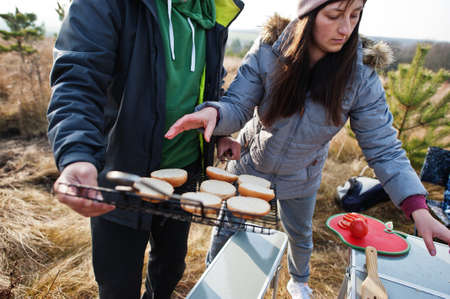 Couple lover cooking food for dinner outside tent together,Enjoying camping concept