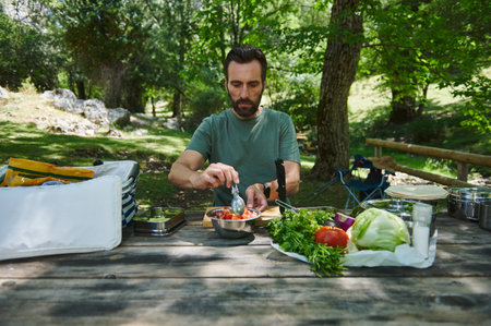 A man crafting a vegetable salad at a park picnic table surrounded by greenery, representing healthy eating, nature, and peaceful outdoor activities.