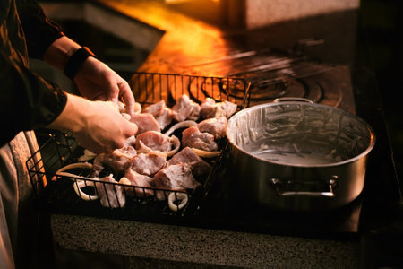 Man fries marinated chicken on a metal grid. Chicken kebab
