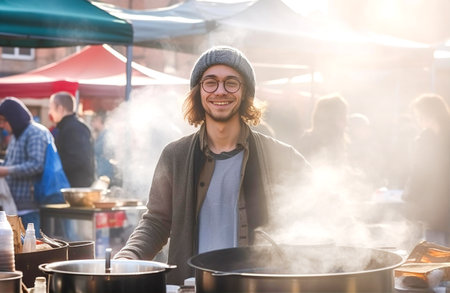 Man, street chef cooking food at street market