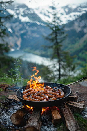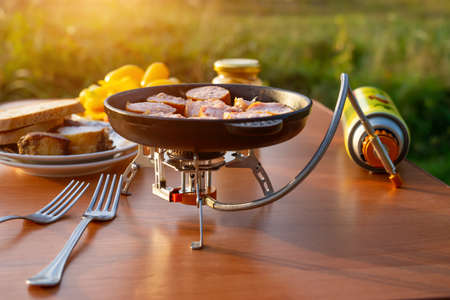 picnic in nature, sausage fried in a frying pan for camping