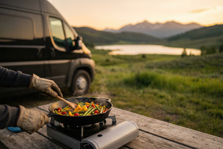 A person cooking a hearty stew in a pot on a portable gas stove during a camping trip. Fresh chopped vegetables and ingredients are laid out on a wooden table with steam rising from the hot food.