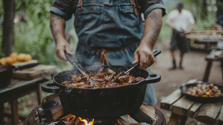 Meat cooking in a large cauldron outdoors over an open fire, a classic outdoor cooking concept for camping and traditional cuisine