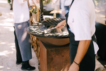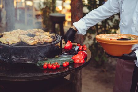 The cook roasts the courgettes. Grilled vegetables. Round bowl-shaped grill with a fire inside.