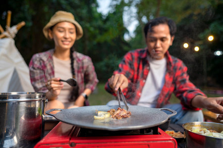 Indonesian southeast asian couple with tongs cooking sliced marinated beef bulgogi on a round grill pan with onions. The scene of the lifestyle of enjoying food in a natural setting