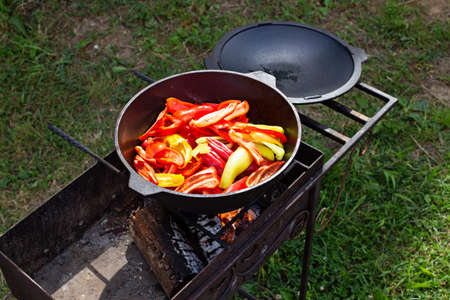 Cooking vegetables on the grill in a cauldron. Cook red, yellow bell peppers in a cauldron.