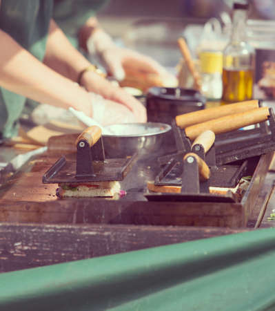 closeup hiker's hands cooking bread on portable grill.