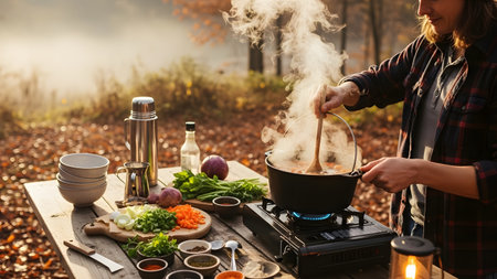A close-up of a camping stove with a pot of soup simmering, surrounded by fresh ingredients, highlighting the joys of cooking outdoors in nature.