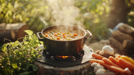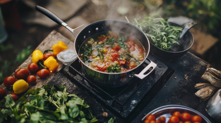 A steaming pot of soup sits on a camping stove surrounded by fresh vegetables. This warm scene captures the essence of outdoor cooking and nature.