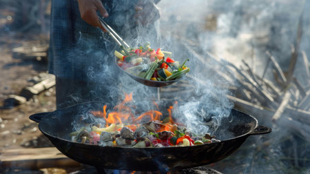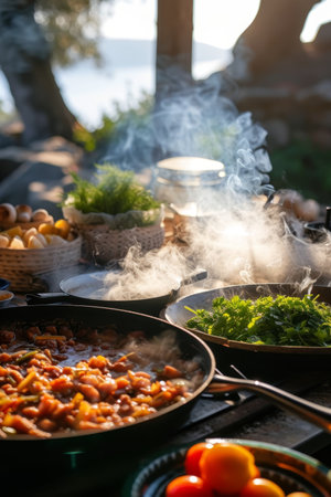 Steam rises from a sizzling pan during an outdoor cooking session with fresh ingredients on a sunny day