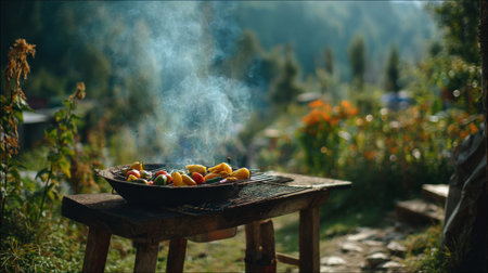 A vibrant display of fresh vegetables grilling on an outdoor barbecue, surrounded by a lush garden, creating a serene atmosphere inviting enjoyment and healthy eating.