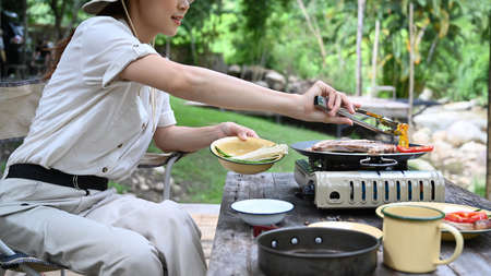 Beautiful young female preparing barbecue outdoors near the river, making a beef steak on picnic stove. cropped and close-up image