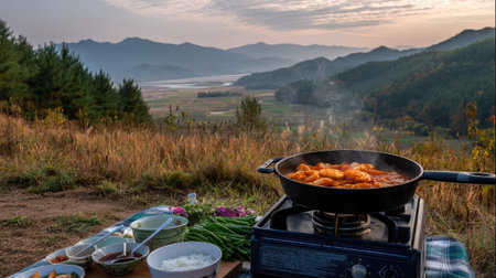 An outdoor picnic-style Korean hot pot setup, with a portable burner and countryside view in the background
