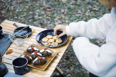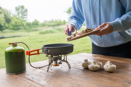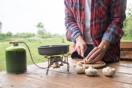 person cooking in nature camping outdoor, cooker prepare breakfast, picnic on metal gas stove, campsite lifestyle