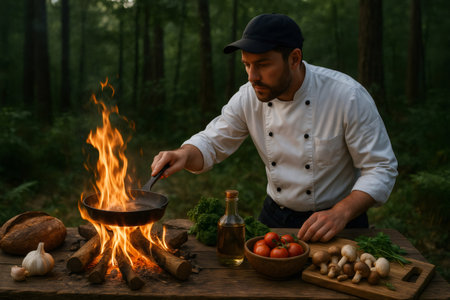 Chef cooking over a campfire in the forest, surrounded by fresh vegetables, mushrooms, herbs, and bread, creating a delicious meal