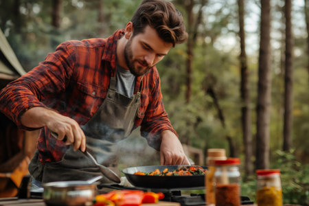 Chef cooking vegetables in a forest campsite using spices from jars, with steam rising from the pan