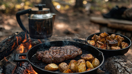 Rustic Wilderness Cooking: Grilled Steak and Roasted Potatoes on Campfire for Outdoor Adventures