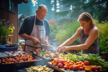 BBQ dinner cooking on house backyard. Caucasian middle aged couple enjoying close connection time on barbecue party. Summer weekend relaxation of happy people in their fifties. AI Generative content