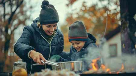 Mother and son preparing food on a campfire in the autumn forest