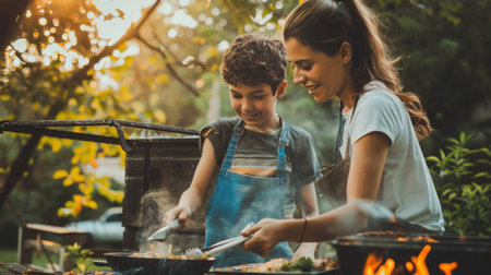 Cute little boy and his mother cooking barbecue in the garden.