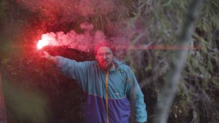 Portrait of the young handsome man with a beard standing in the middle of the forest and holding red signal flare. Stock footage. Traveler looking for help in wild nature.
