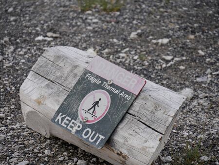 Warning sign on a slab of wood at a thermal area advising people to keep out