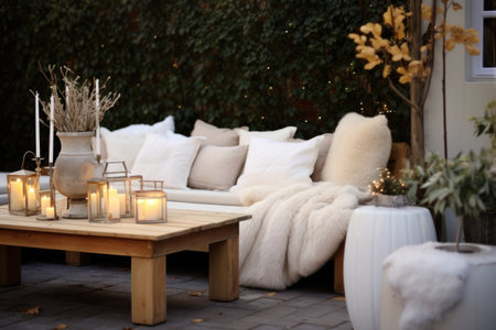 outdoor seating area dressed with fur throws, created with generative ai