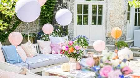 A beautifully curated outdoor lounge area featuring a comfortable sofa adorned with plush cushions, surrounded by a vibrant display of flowers and greenery, perfect for relaxation and enjoyment in a sunlit environment.