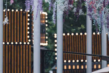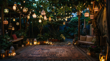 patio decorated with hanging lights and garden lamps generative ai