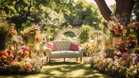 Beautiful flower garden in summer time with vintage style sofa and flowers