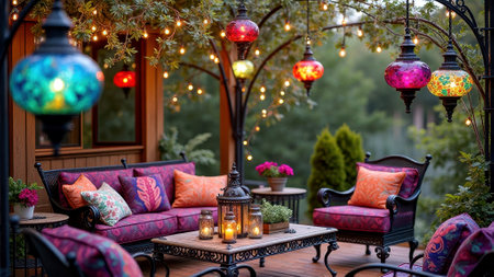 Colorful lantern-lit patio with vibrant seating and cozy ambiance. That the image is generated using AI.