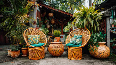 This image showcases a cozy outdoor living space adorned with stylish rattan chairs and vibrant greenery, creating a serene atmosphere perfect for relaxation.
