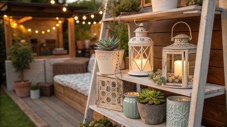 A small shelf displays charming decor items such as vintage lanterns and succulents infusing character into the outdoor nook and showcasing personal style..