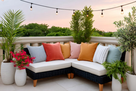 A charming and cozy outdoor space adorned with colorful cushions, twinkling fairy lights, and lush greenery. Perfect for relaxation and gatherings.