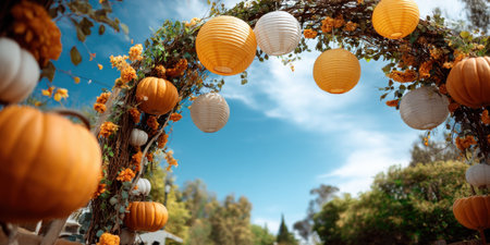 Orange lanterns and white paper lanterns hang on floral arch under bright blue sky, creating festive and warm outdoor scene