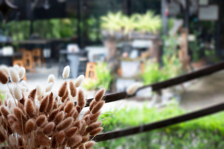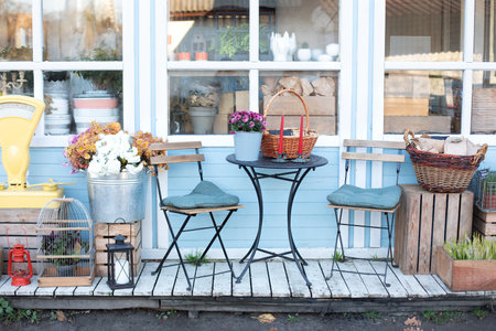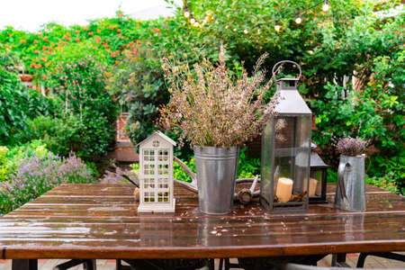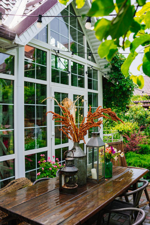 wooden table with lanterns and dried flowers. The yard in the house is with panoramic glazing. decor for a garden or park. Cozy summer courtyard.