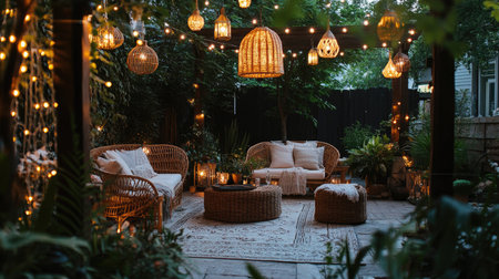 This cozy outdoor patio features warm lighting and wicker furniture that create a serene ambiance perfect for evening relaxation and gatherings.
