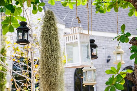 Decorative candle lantern hanging in tree in garden