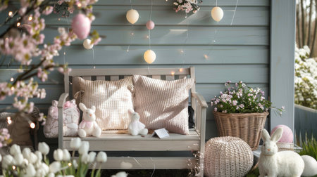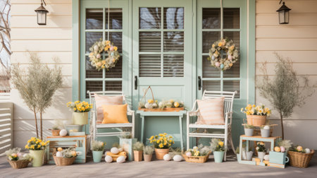 Easter Themed Porch with Spring Decor. A charming porch with Easter-themed pillows and decorations, surrounded by spring blossoms, creating a festive outdoor nook.