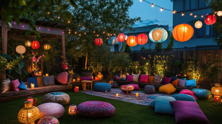 A vibrant outdoor space perfect for evening gatherings, featuring colorful cushions and warm lantern light, creating a cozy and inviting atmosphere for relaxation.