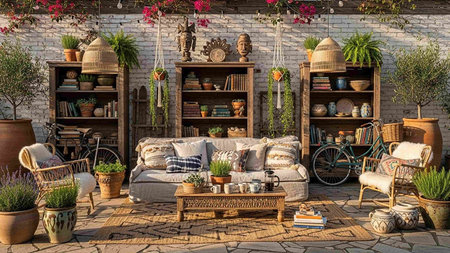A charming outdoor patio with comfortable seating, earth-tone cushions, and lush green plants
