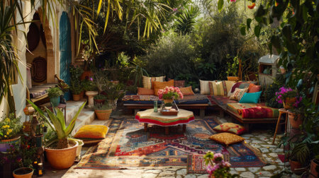 This inviting outdoor seating area features stylish cushions, decorative lanterns, and lush plants, creating a perfect retreat for relaxation and socializing.