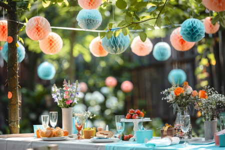 Happy birthday. Outdoor Festivals. backyard or park transformed into birthday party paradise, adorned with decorations, picnic blankets, and outdoor games, creating a fun and festive atmosphere