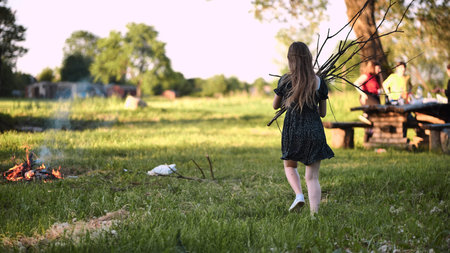 The girl has collected dry branches and is going to throw them into the fire at a picnic.