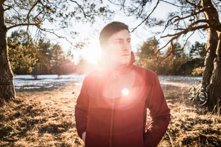 A young man adventurer with contrast yellow jacket posing in a jungle with mystery lighting