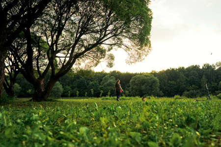 Young happy woman with dreadlocks walk with small dog corgi in park. Back view.