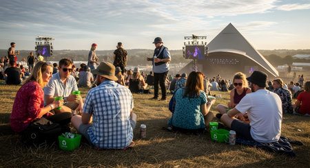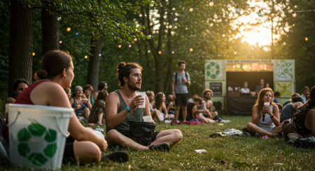 a group of people are enjoying an eco friendly outdoor event on a sunny day, sitting on the grass and listening to music in a relaxed atmosphere 136