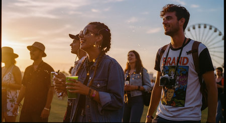 A group of friends enjoying a music festival outdoors, with one person holding a camera and smiling, string lights in the background, a lively atmosphere