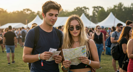 a young couple at a music festival consults a map and tickets, planning their day amidst the crowd and tents, enjoying the summer atmosphere and togetherness.