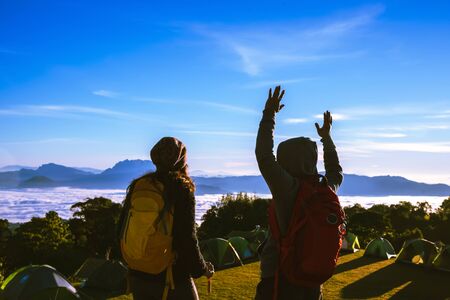 Young couple Camping Hiking Journey Travel Trek Concept, Holiday travel, Travel relax, Natural Touch countryside, in Thailand.
